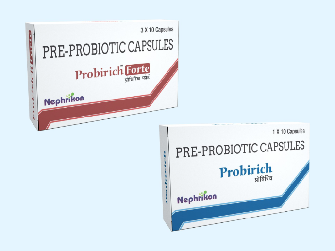 Probirich capsule contains pre- probiotics 15/pre- probiotics 45 billion CFU billion CFU which may reduce inflammation, remove uremic toxins from the colon, and retard the progression of CKD by restoring the symbiosis of gut microflora in patients with CKD and help to maintain healthy kidney function.