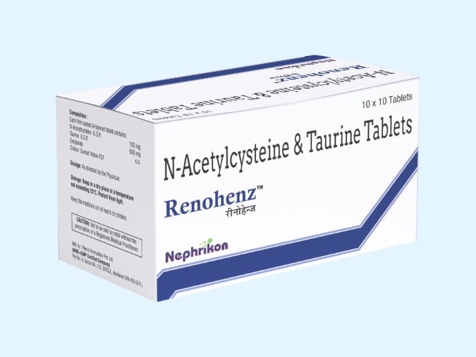 Renohenz tablet contain combination of N-Acetylecysteine & Taurine ,used in the treatment of diabetic kidney disease. Renohenz protects the kidneys from damage and reduces the risk of kidney failure. Renohenz is also used in CIN.