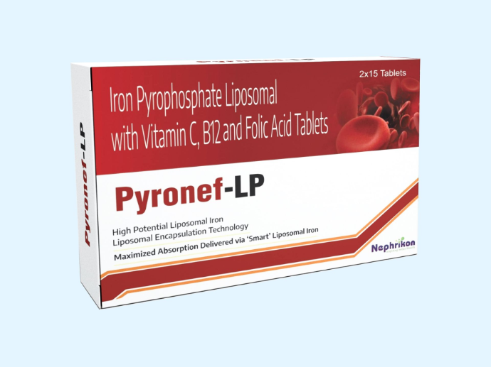 Pyronef LP is tablet which contains Iron Pyrophosphate 30mg+ Vit C 35mg+ Vit B12 0.5mcg and Folic Acid 570mcg. Pyronef LP is used as supportive oral hematinic formulation, particularly useful in chronic kidney disease (CKD) or renal-compromised patients with iron deficiency anemia or megaloblastic tendencies.